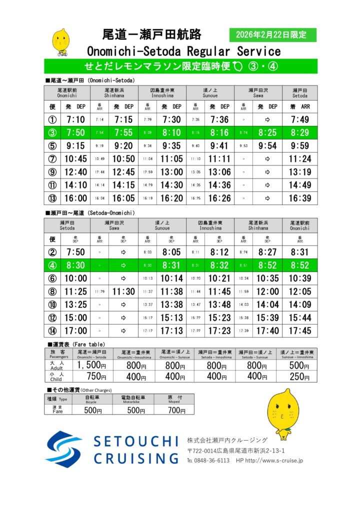 瀬戸内クルージング株式会社のご協力のもと、大会当日は尾道 – 瀬戸田航路のフェリーが増便されます。