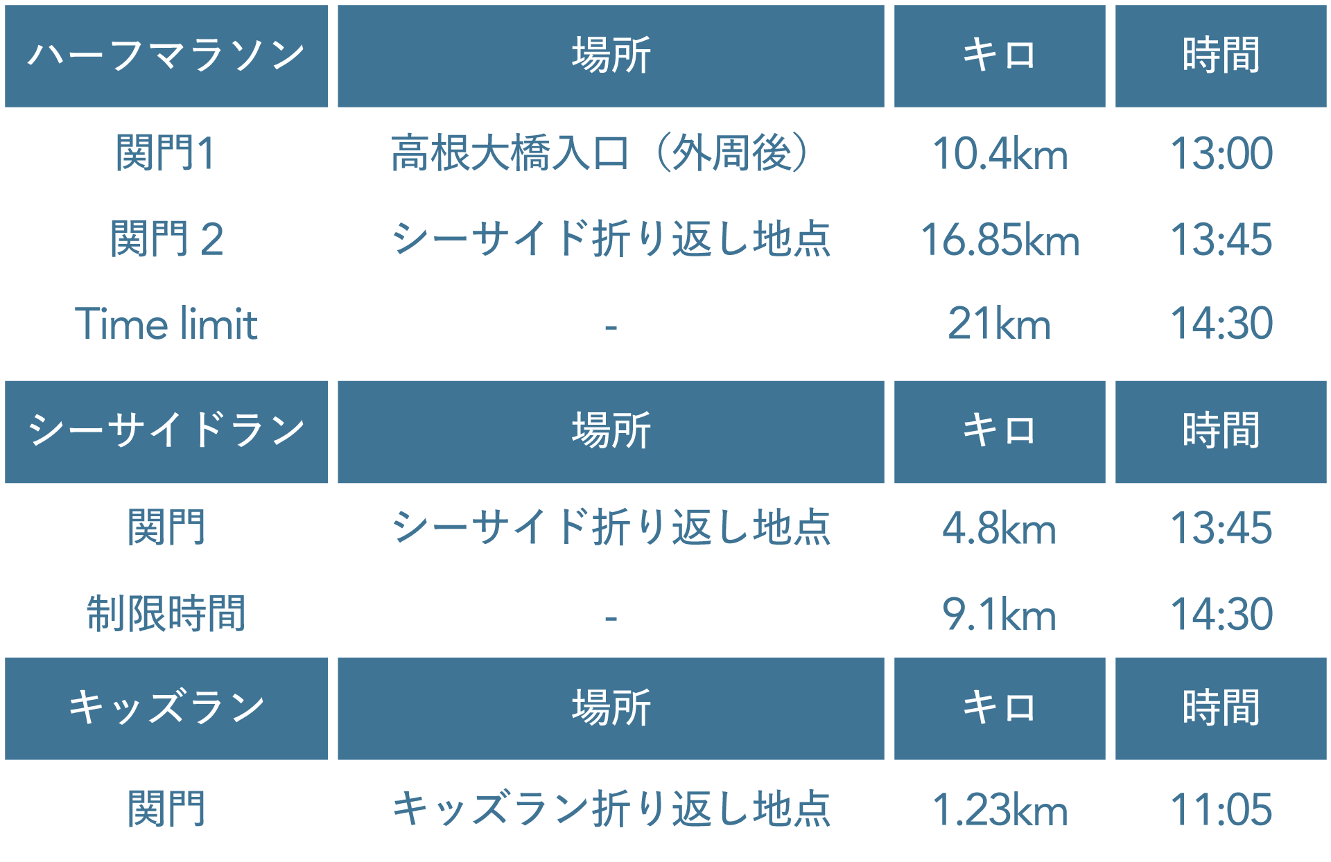 | 種 目 | ハーフマラソン 21.0975km シーサイドラン 9.1km キッズラン(高) 3,2km キッズラン(低) 1,8km |